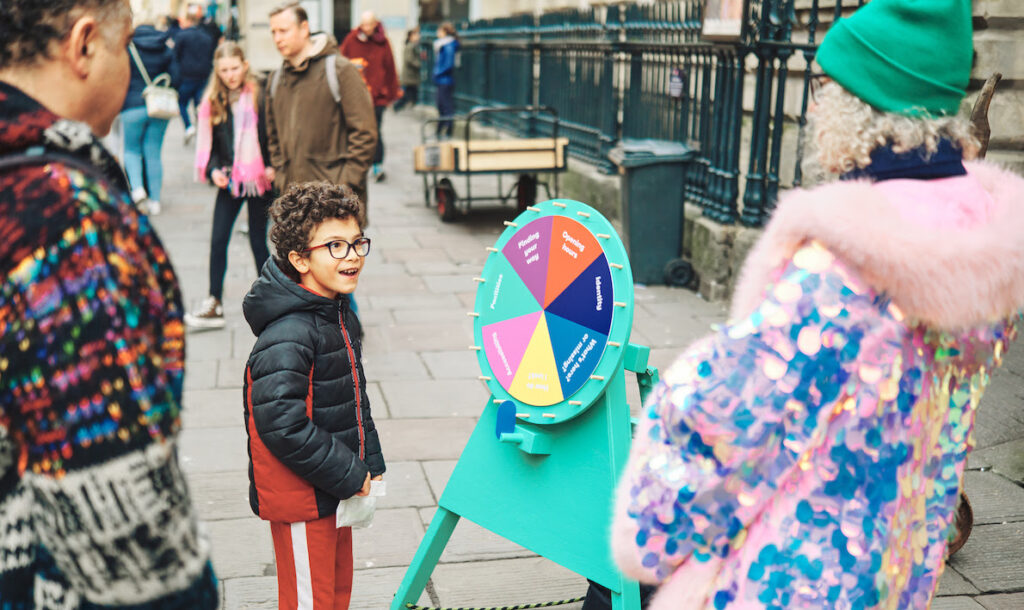 Malcolm:  Absolutely. It’s a lot about the invitation, I think. The other day, in St. Nicholas’s Market, there was a man whose feedback afterward was  ‘…if you’d come at me with a clipboard, I’d have run a mile’. Instead, we had made an offering using colour, moving parts and and quick games. Our spinning wheel, for instance is physically inviting and fairly familiar to most people. And through that, people’s curiosity is sparked and they choose to join in. We spend time making sure the materials, props and even our outfits are inviting. We don’t jump out at people, we draw them in.