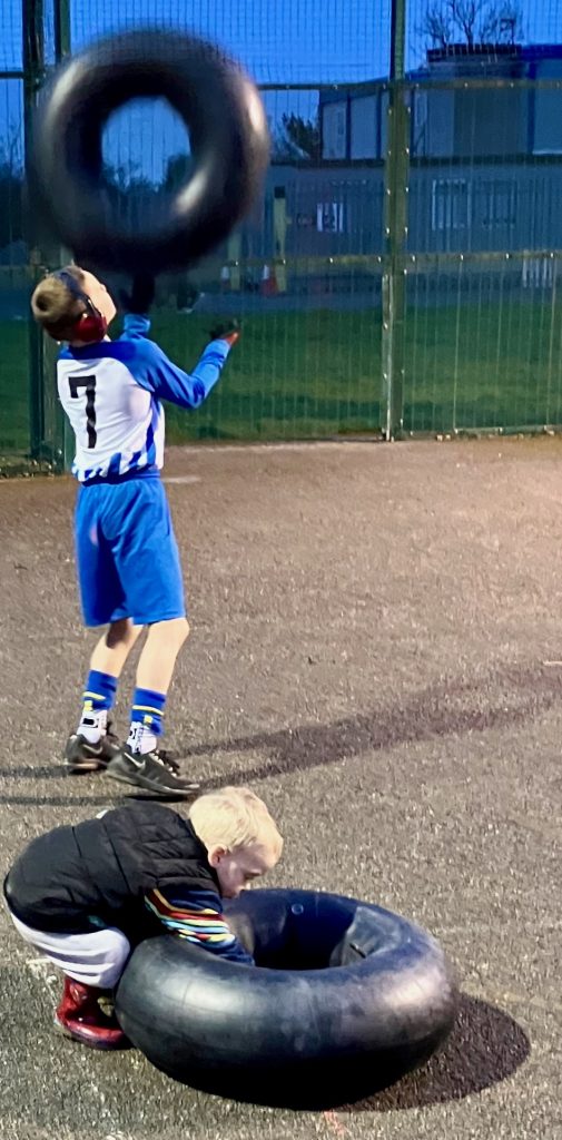 The second phase was devised in partnership with Woodland Tribe, inviting them to deliver an adventure playground building session and building relationships with surrounding schools and community stakeholders. We hired the local football club, where there was a MUGA (basketball court) enabling us to leave the structure overnight. We used ideas from the engagement as starting points such as a tower, then the children built ideas using wood, saws, drills, hammers and ropes to explore the kinds of play provision they enjoyed playing in.
